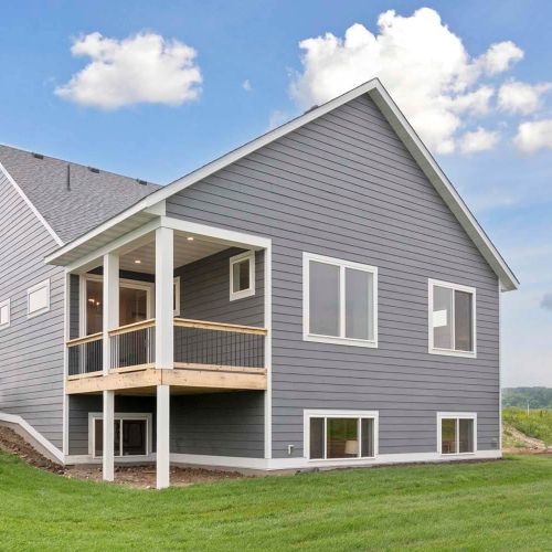 - LP SmartSide® prefinished board & lap siding with wrapped windows and trim boards on the front façade. White windows and stone accents on front elevation