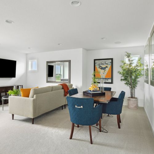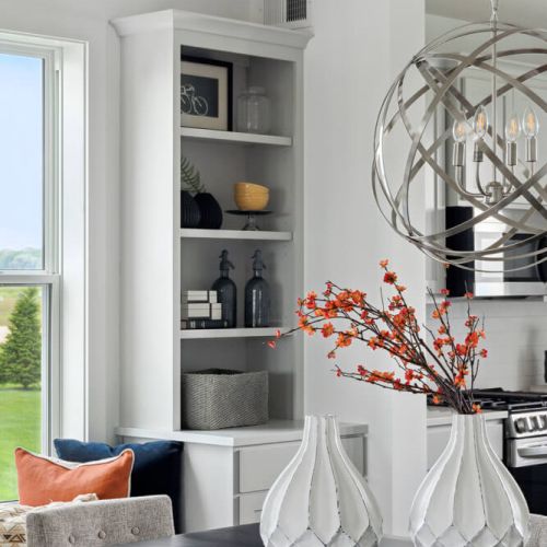 - Open dining room with optional cabinets, shelves, and built-ins