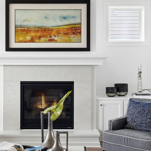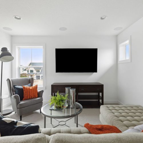 - Gathering room features expansive windows and optional fireplace & media cabinet