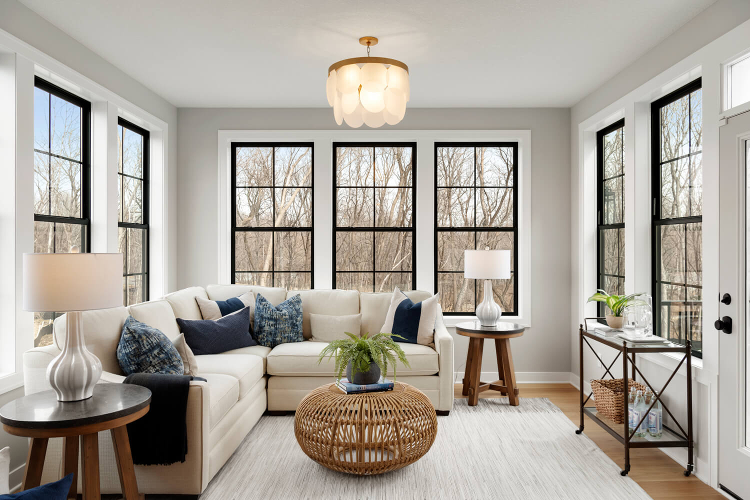 - Gathering room features wall of windows, fireplace, and optional built-in cabinetry