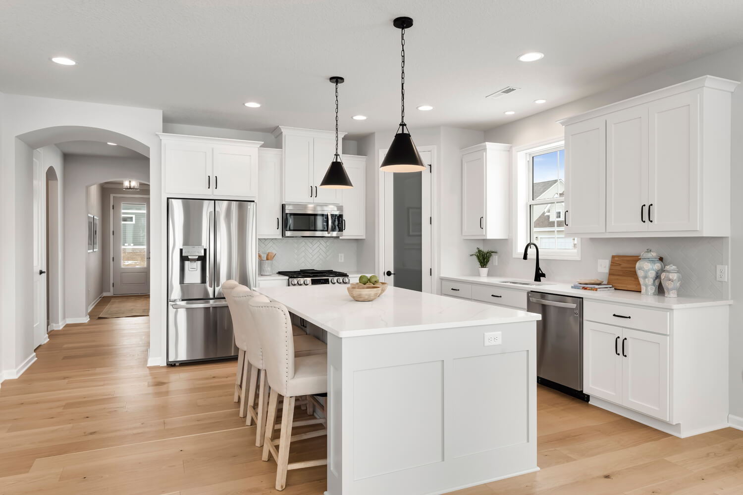 - Open transitional kitchen with custom cabinetry, window over sink, oversized center island, and spacious pantry