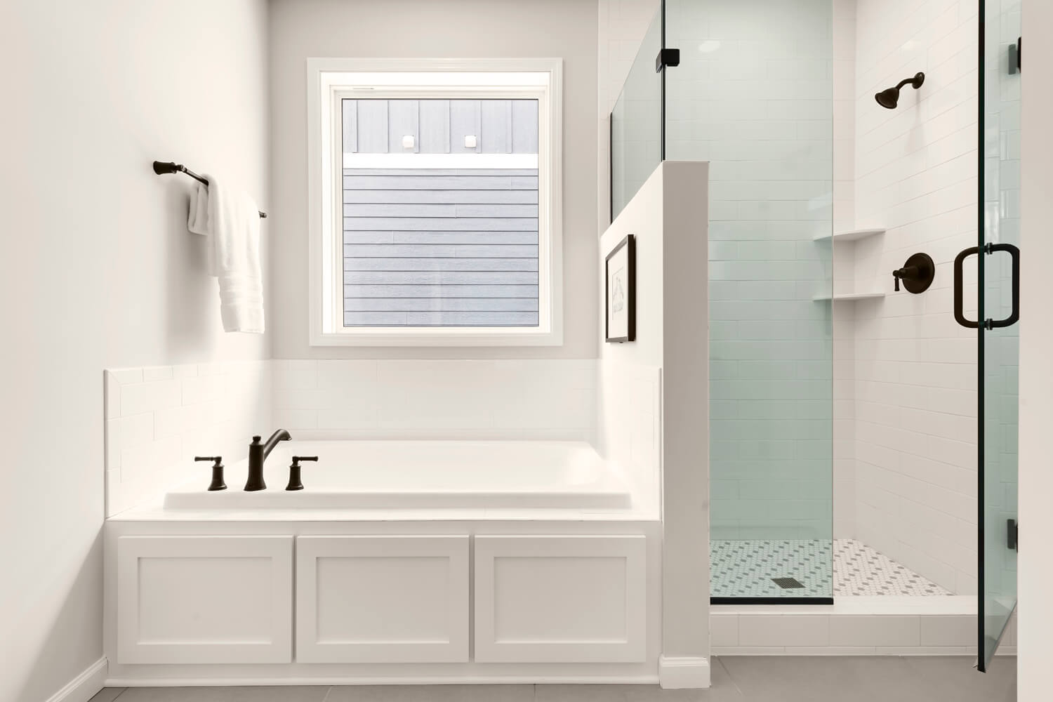 - Tranquil main level owner’s retreat with spa bath includes double vanity, soaking tub, separate shower, private water closet, and spacious walk-in closet