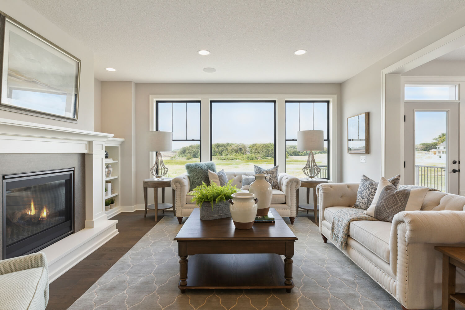 - Gathering room with expansive windows, fireplace and optional built-in cabinetry