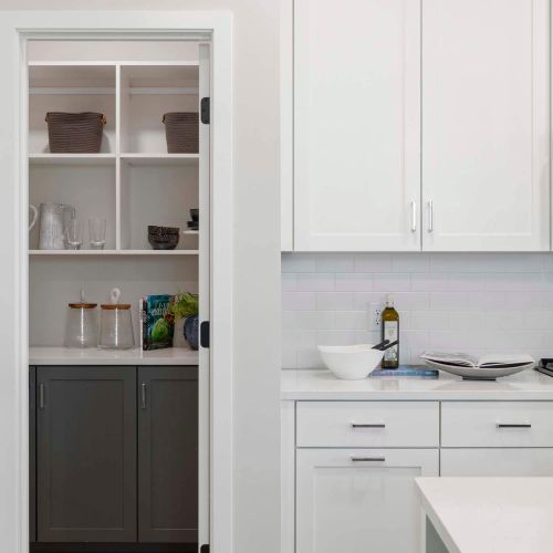 - Kitchen with 42′ upper cabinets, island, double garbage roll-out, and walk-in pantry