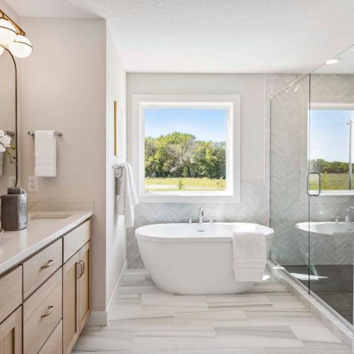 - Luxury owner’s bath complete with, free-standing tub, ceramic tile shower with frameless glass, private water closet, and double vanities
