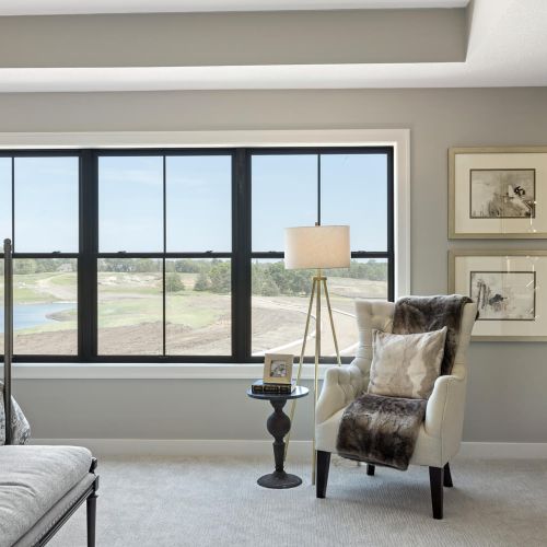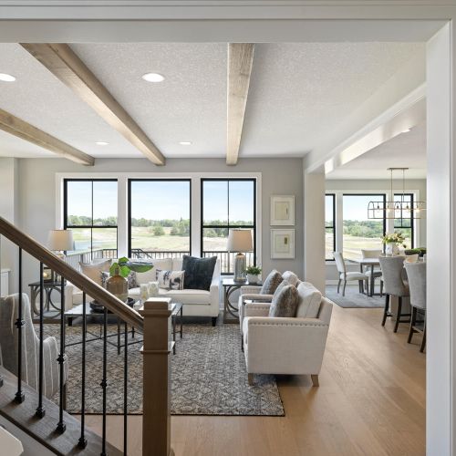 - Gathering room features wall of windows and fireplace flanked by optional built-ins