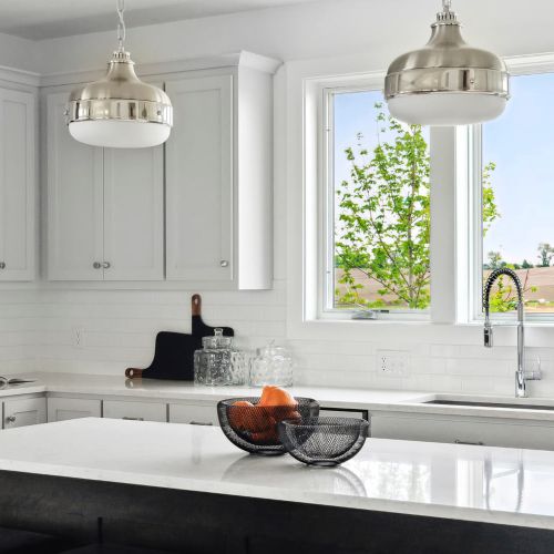 - Light-filled kitchen featuring sink with large windows, center island and two pantries