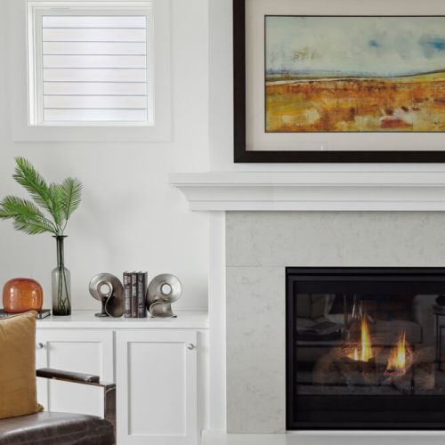 - Gathering room features expansive windows and optional fireplace & media cabinet