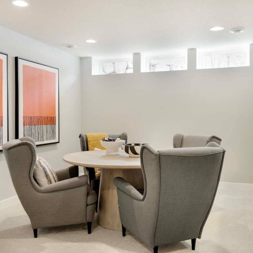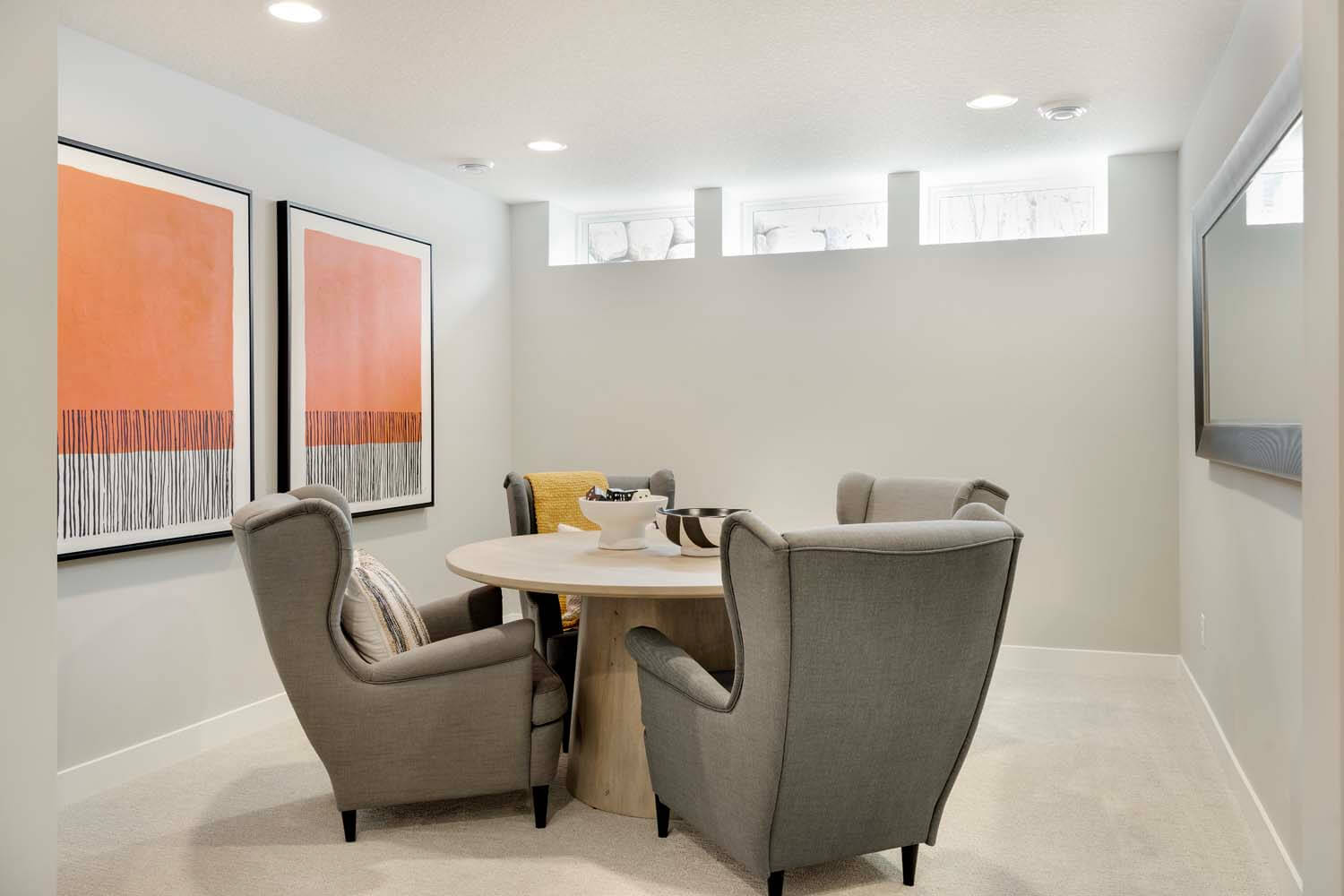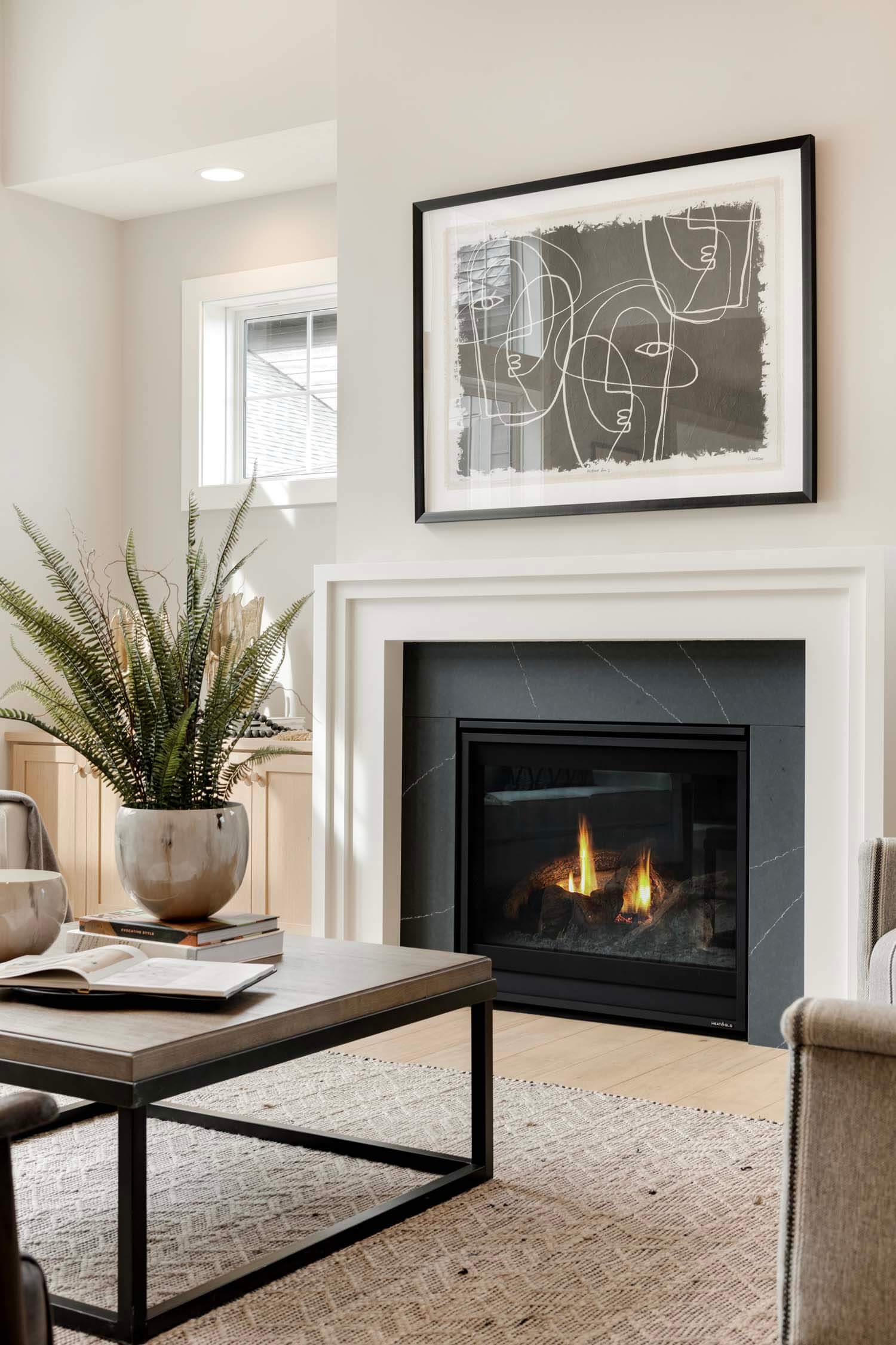 - Vaulted gathering room with fireplace and optional built-in cabinetry