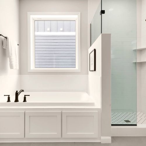 - Tranquil main level owner’s retreat with spa bath includes double vanity, soaking tub, separate shower, private water closet, and spacious walk-in closet