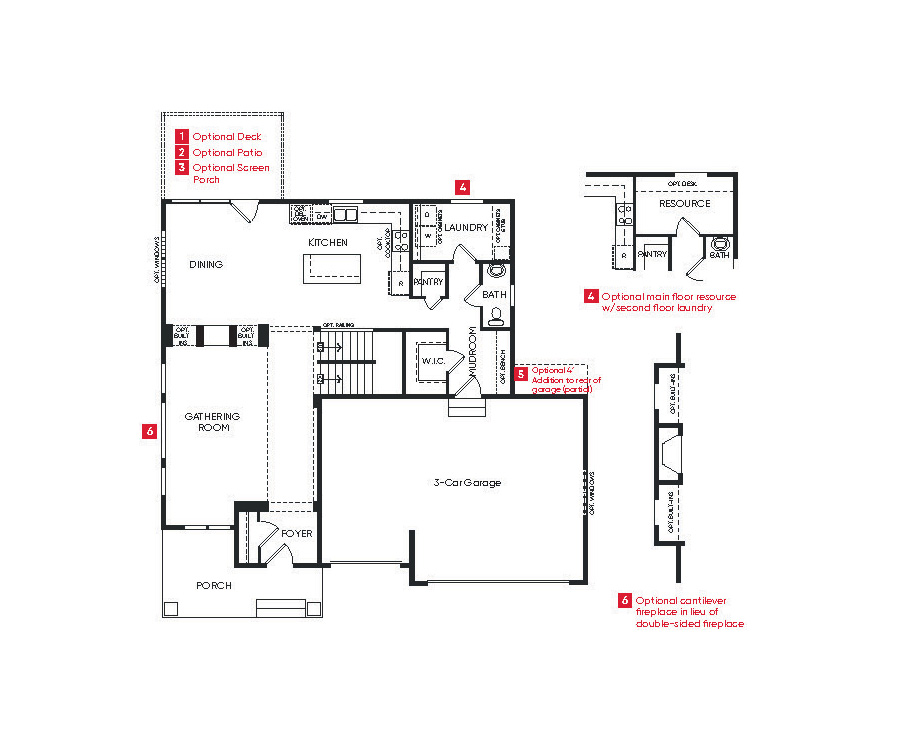 - 2-sided fireplace with optional built-ins between gathering and dining rooms