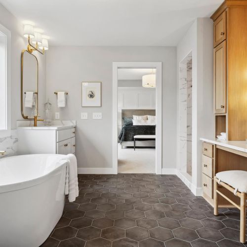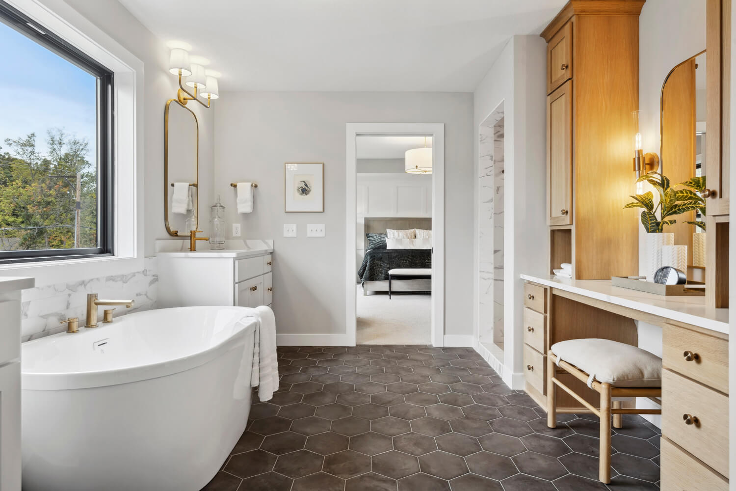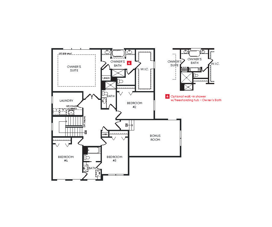 - Optional owner’s bath with freestanding tub, walk-in shower, and dressing table