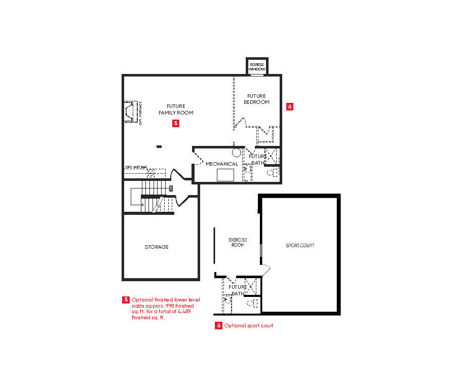 - Finished staircase to lower level with space for future family room, bedroom, bath, and storage space